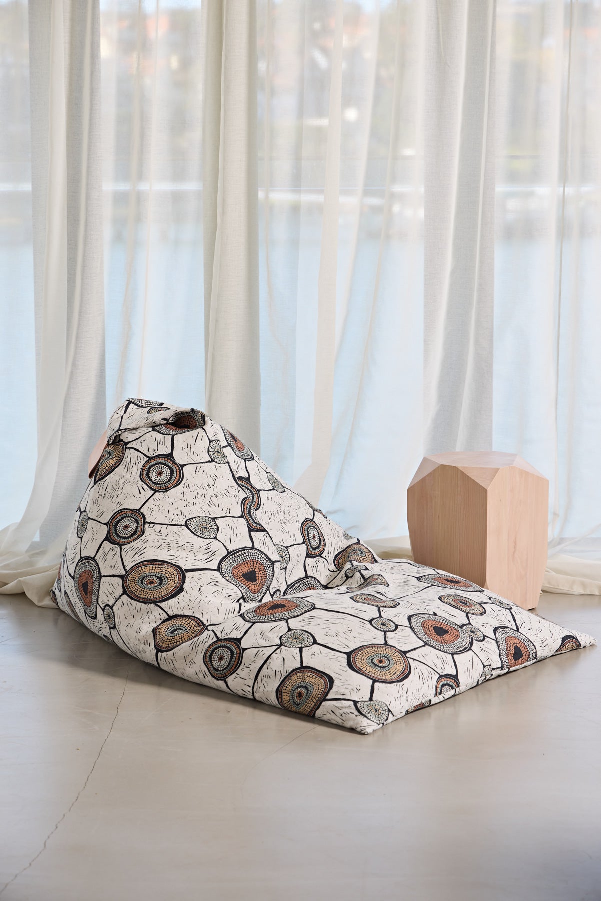 Each bean bag cover is thoughtfully crafted from premium materials including pre-washed denim, durable canvas, buttery-soft leather, or limited edition Dali Dyalgala First Nations designs—offering a range of textures and tones to suit any space