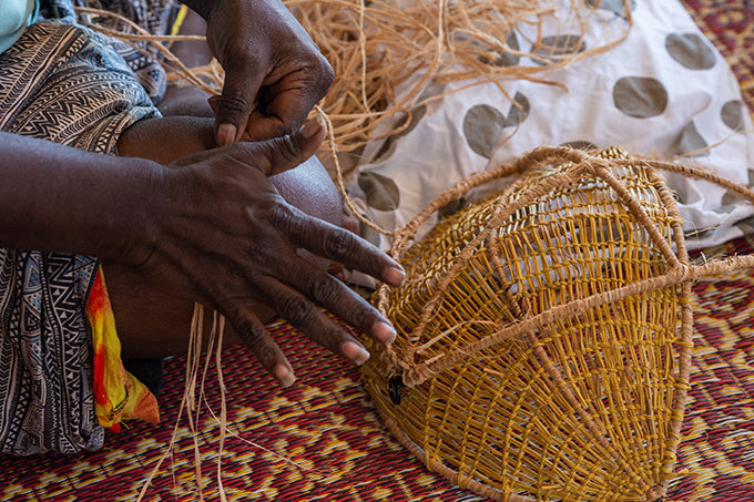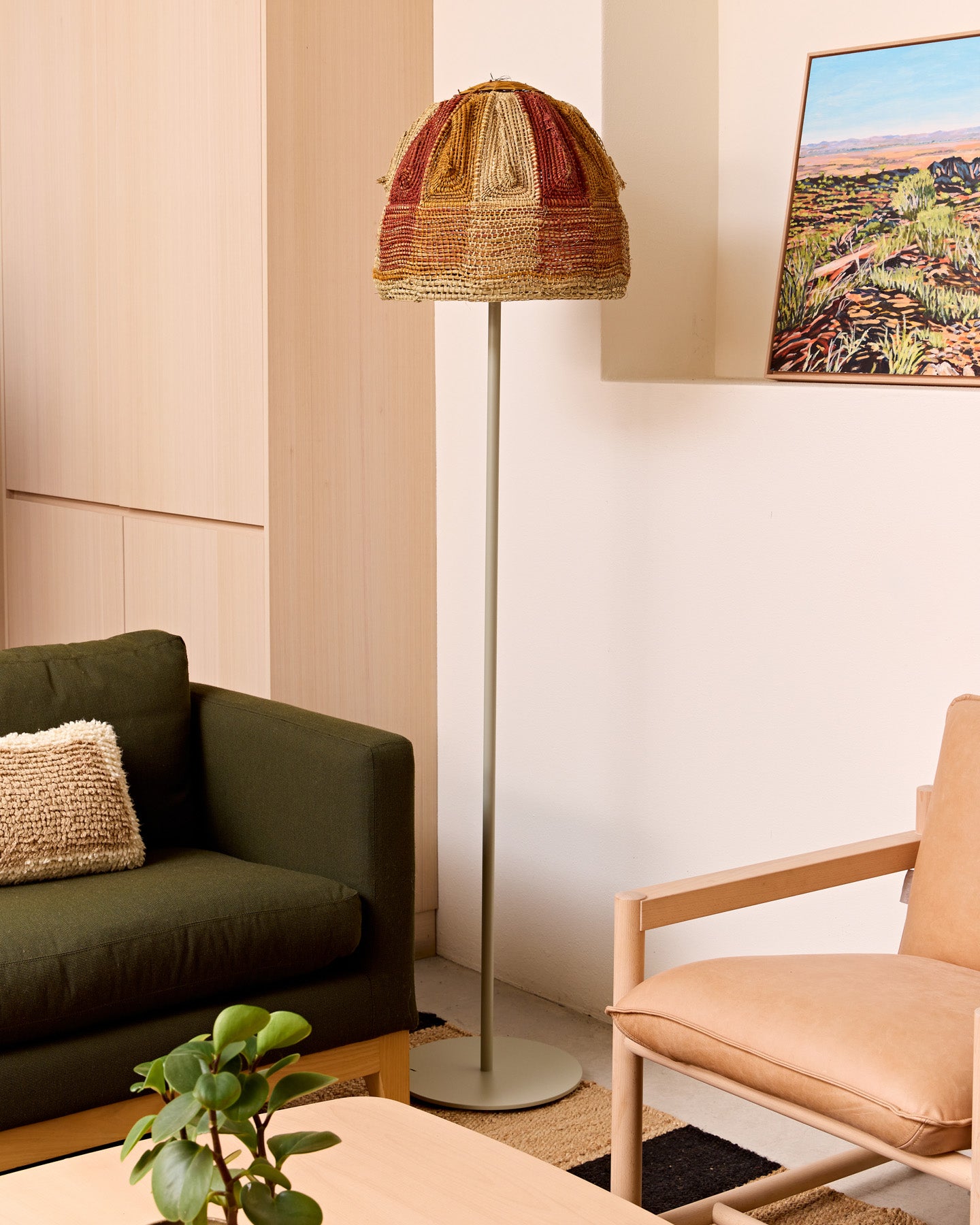 Every pendant or wall light is handwoven by Aboriginal and Torres Strait Islander artists using locally harvested plant fibres and natural, hand-made dyes. These materials are gathered through labour-intensive processes that maintain cultural practices and support community-led environmental stewardship—from foraging and dyeing, to weaving and finishing.