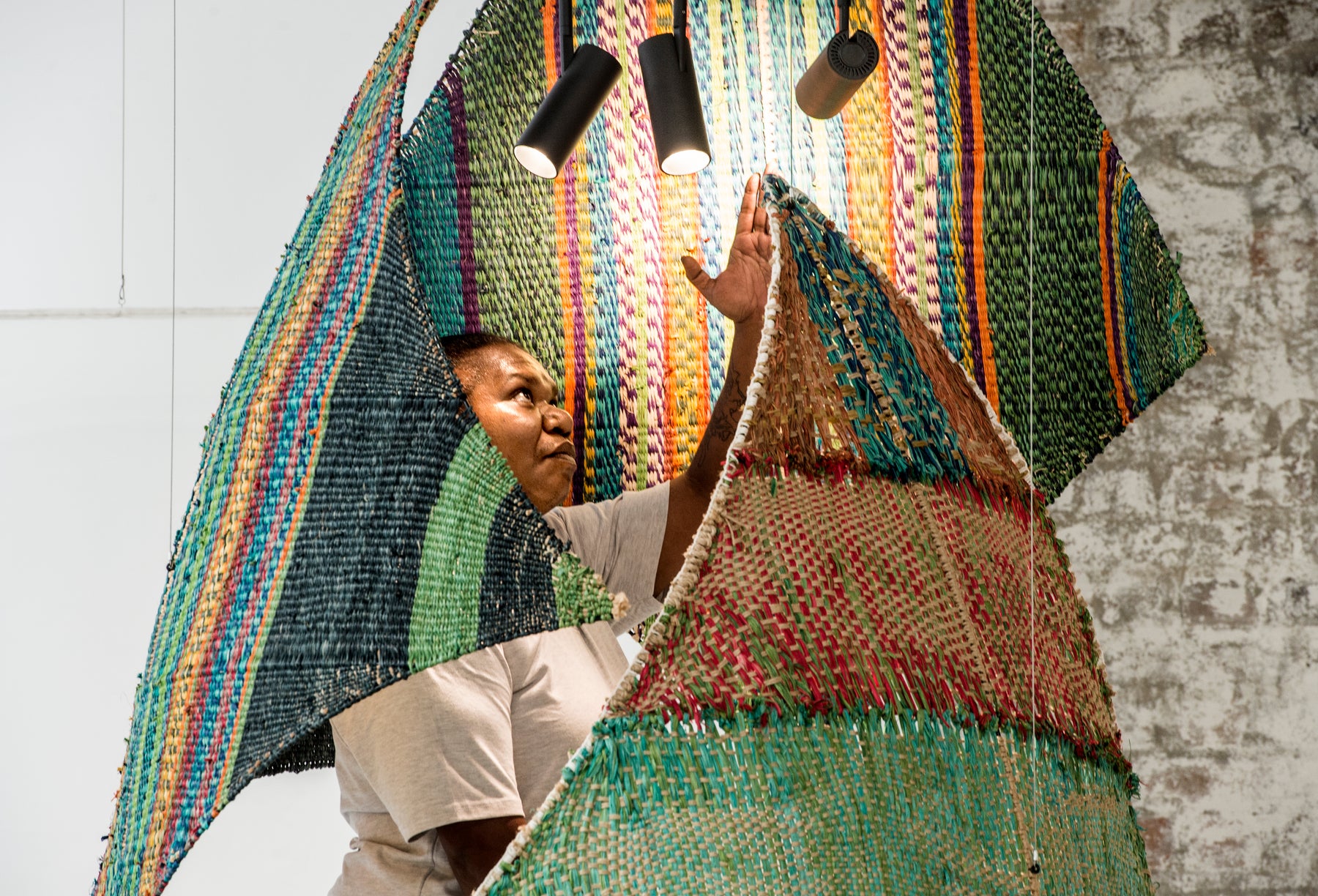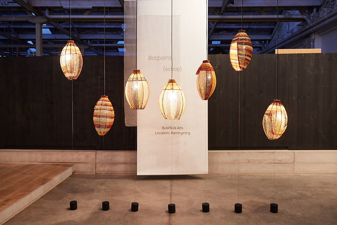 The Batjbarra (scoop) range is a collection of illuminated and suspended weavings created by the women of Bula'Bula Arts in Ramingining, North East Arnhem Land.