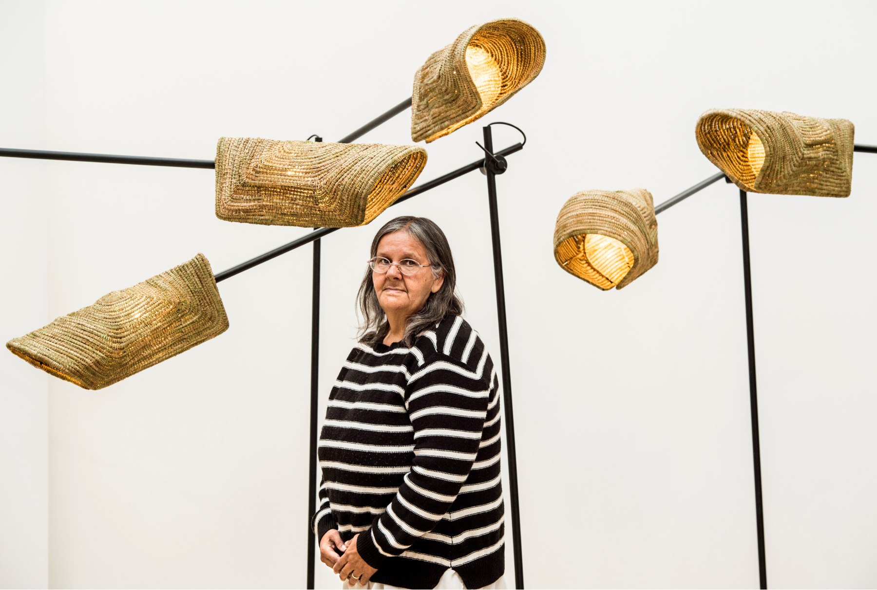 The weavers of Bula Bula Arts, Ramingining, in North East Arnhem Land usually create traditional ceremonial and ritual objects, working together as a group to harvest materials and develop work. This lighting collaboration with Koskela was one of the first times the weavers embraced making objects which are not traditional yolngu objects and the strength of their identity as late career Yolngu Artists is distilled in these lampshades.