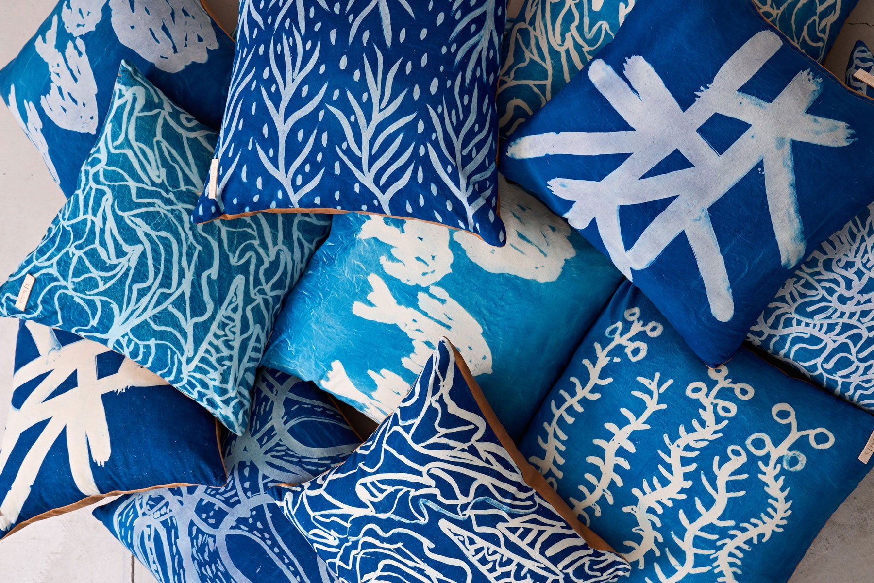 The cushions have culminated from the ‘Blue and White project’, a new extension of the artists’ practice which saw a departure from their renowned soft sculpture work. Artists experimented with cyanotype printing - an old photographic technique. This technique developed a new colour - beautiful blues, created by the exposure of the sun.