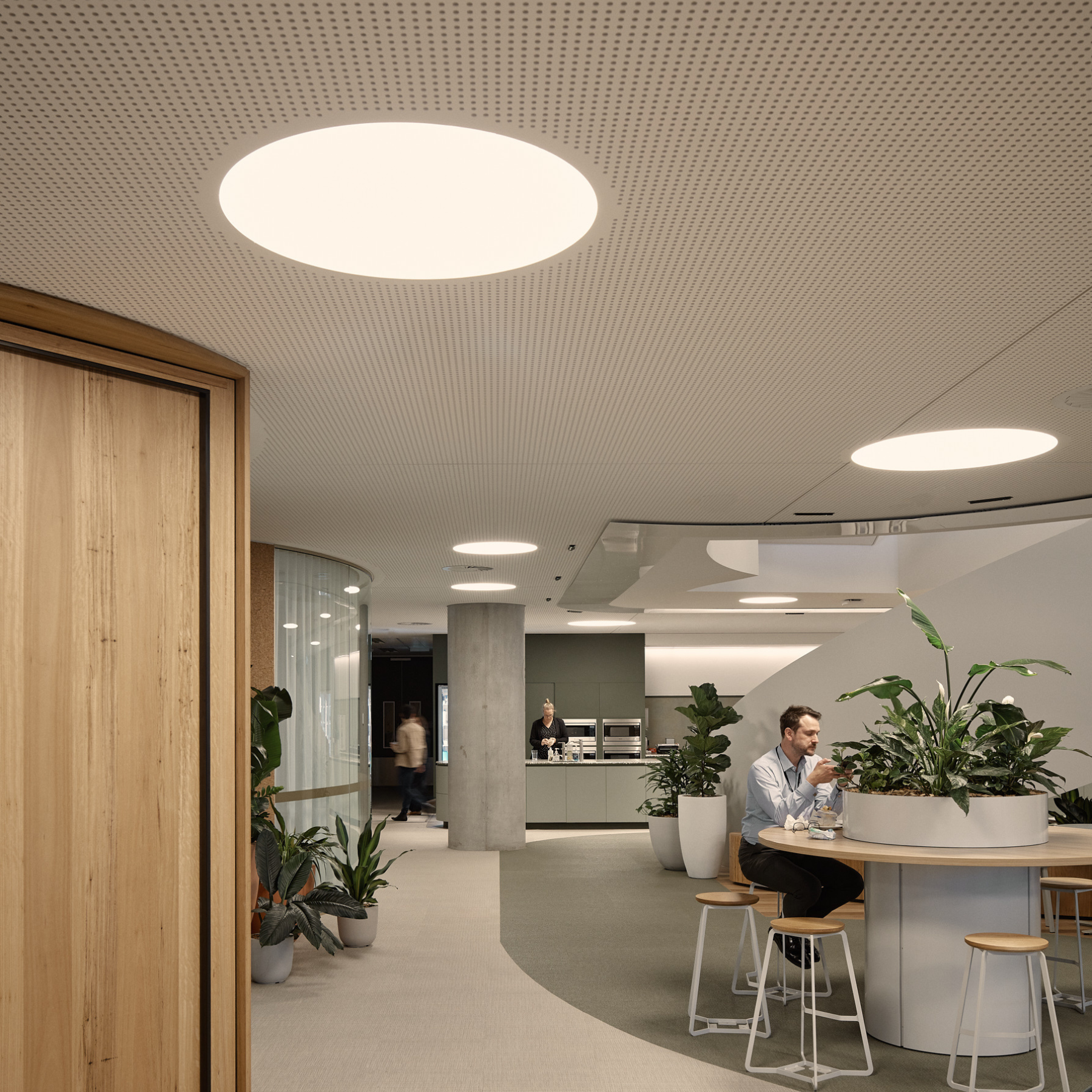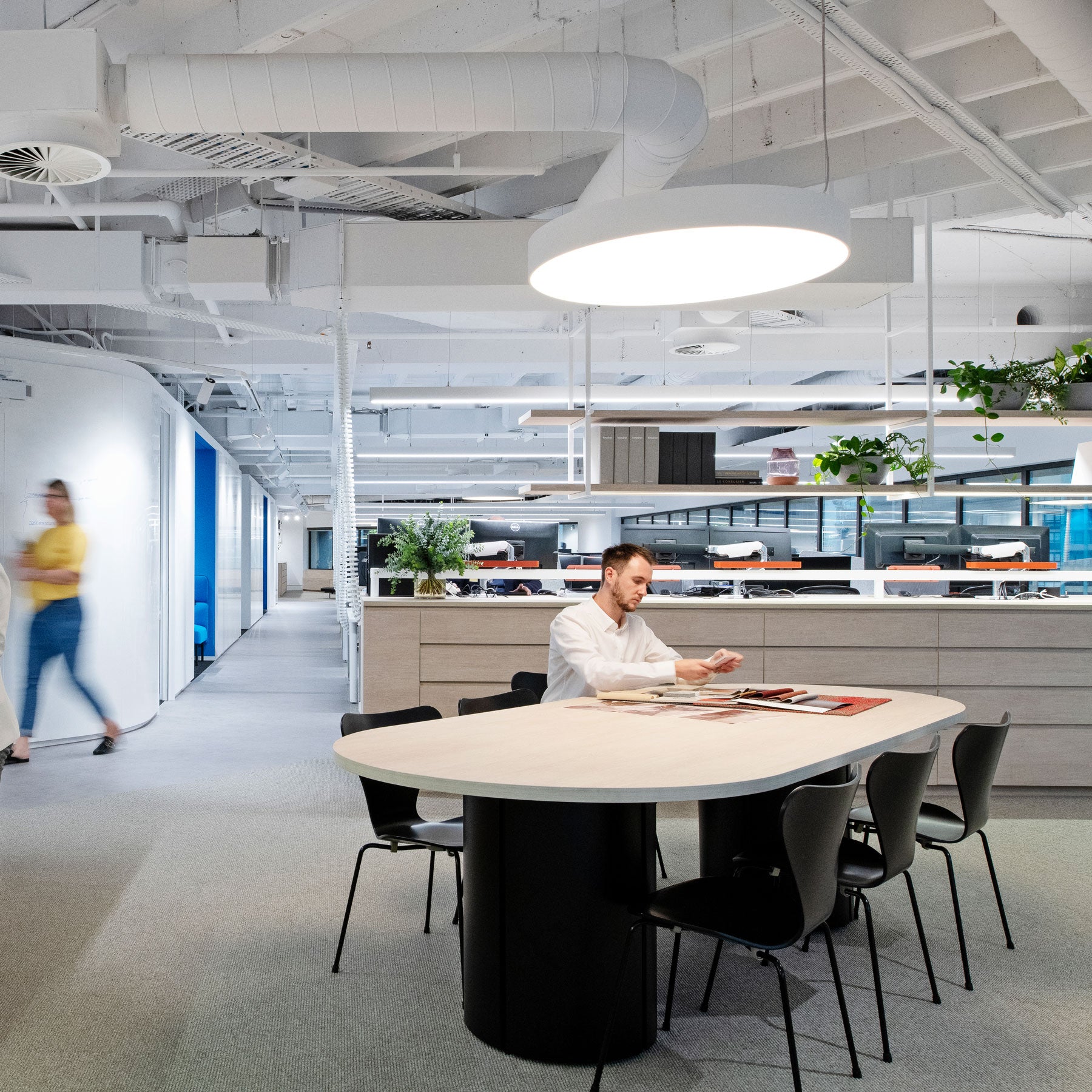 This is a round office table with a feature-packed and customisable design. The powder-coated steel base is available in two sizes, a 4-5 person or a 6-8 person. For seamless connections a floor box can be hidden underneath the table with cables running through the hollow base to an outlet mounted on the tabletop. It’s also easy to remove panels from the base to undertake any electrical work. Hidden adjustable glides ensure stability at all times.